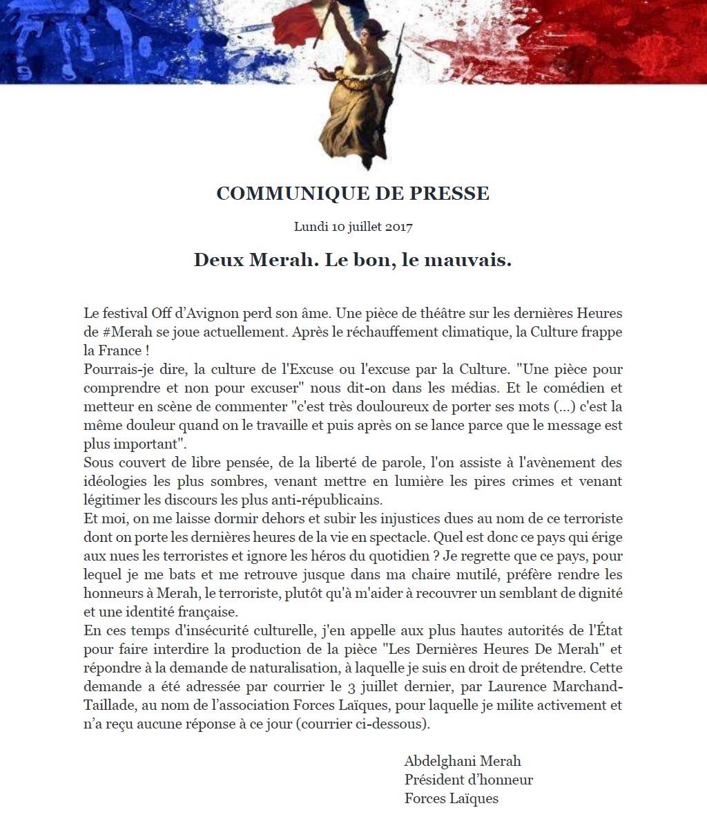 Abdelghani Merah «en appelle aux plus hautes autorités de l’Etat pour faire interdire la production de la pièce».