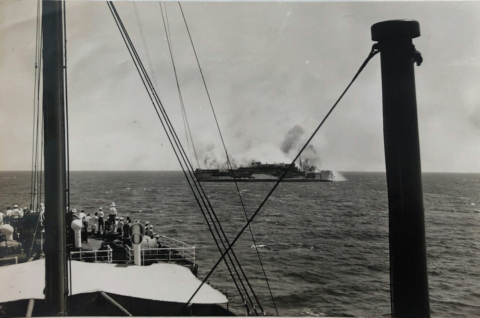 Le Georges Philippar en feu dans la matinée du 16 mai 1932. Photographie prise depuis le pont d’un des navires venus à la rescousse, le Hakone Maru. Collection French Lines & Compagnies