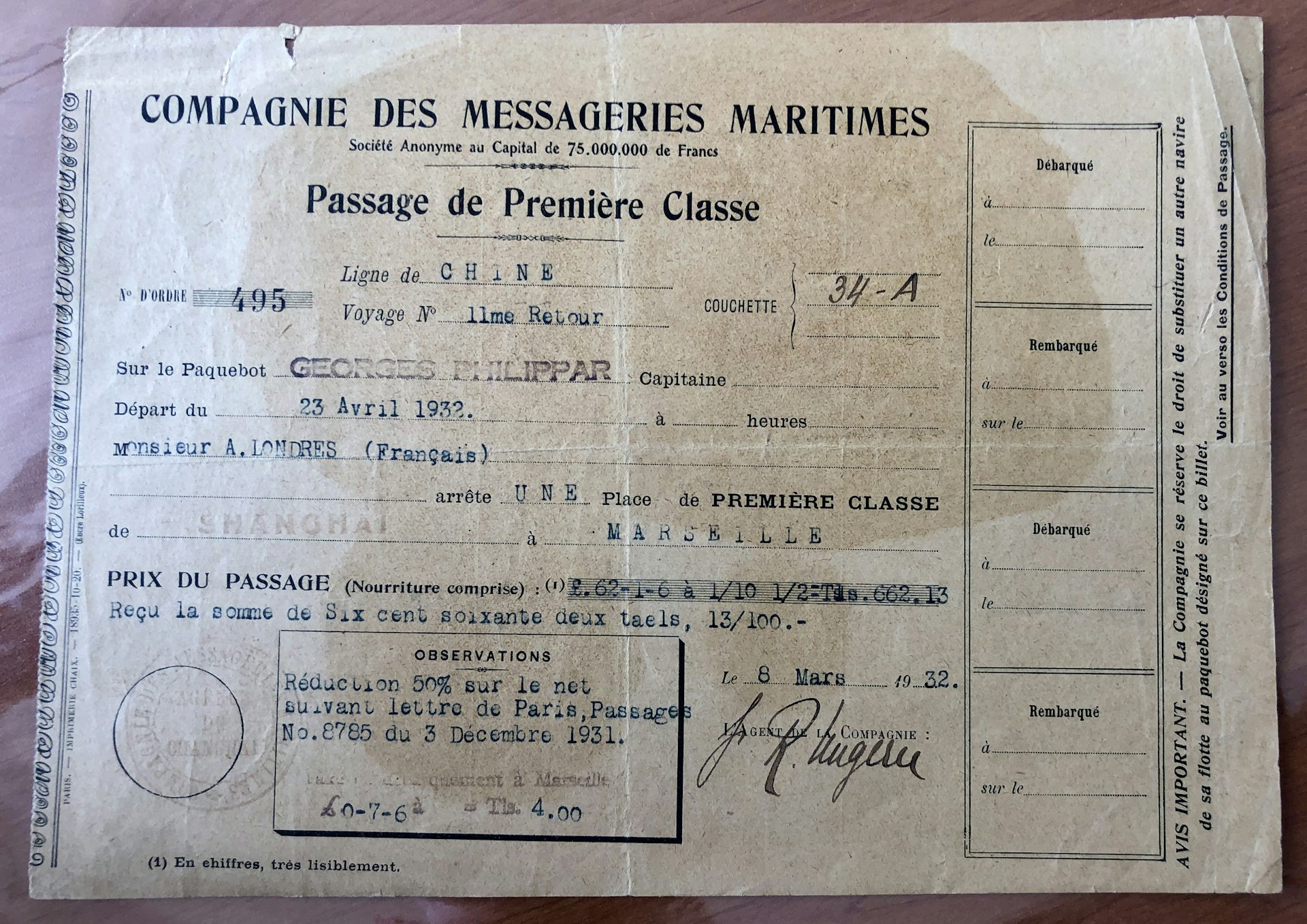 Le billet de passage de Shanghaï à Marseille au nom du journaliste Albert Londres. Collection French Lines & Compagnies