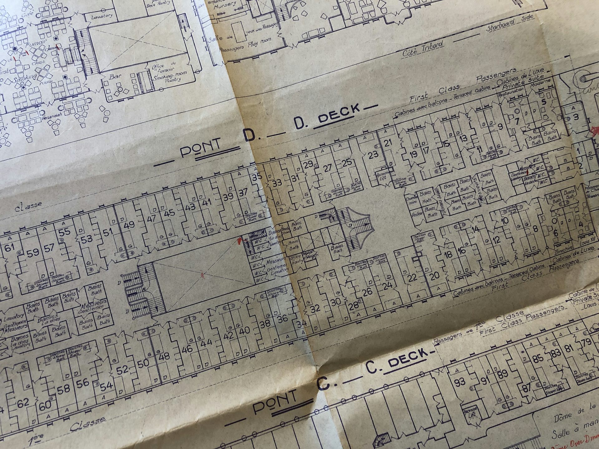 Détail du plan du Georges Phillipar, en particulier le pont D. Le feu s’est déclaré dans la cabine n°5. Albert Londres logeait de l’autre côté en cabine 34. Collection French Lines & Compagnies