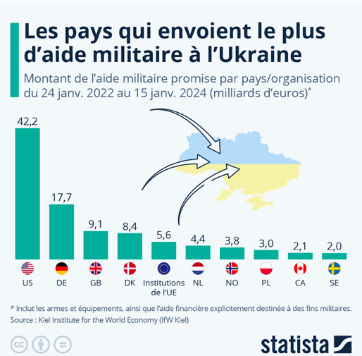Malgré ce contexte de crise, Berlin se refuse toujours à rouvrir les vannes du Nord Stream, dont une partie des tubes est encore en état de fonctionner. C’est d’autant plus énigmatique que la nation allemande s’était transformée, depuis sa réunification, en véritable «société-machine» dédiée à la production. En outre, l’Allemagne a massivement soutenu l’effort de guerre ukrainien, débloquant près de 18 milliards d’euros d’aide militaire entre le 24 février 2022 et le 24 janvier 2024. Seuls les Etats-Unis ont fait mieux (voir graphique ci-dessous), mais toujours au bénéfice de leur industrie de l’armement.