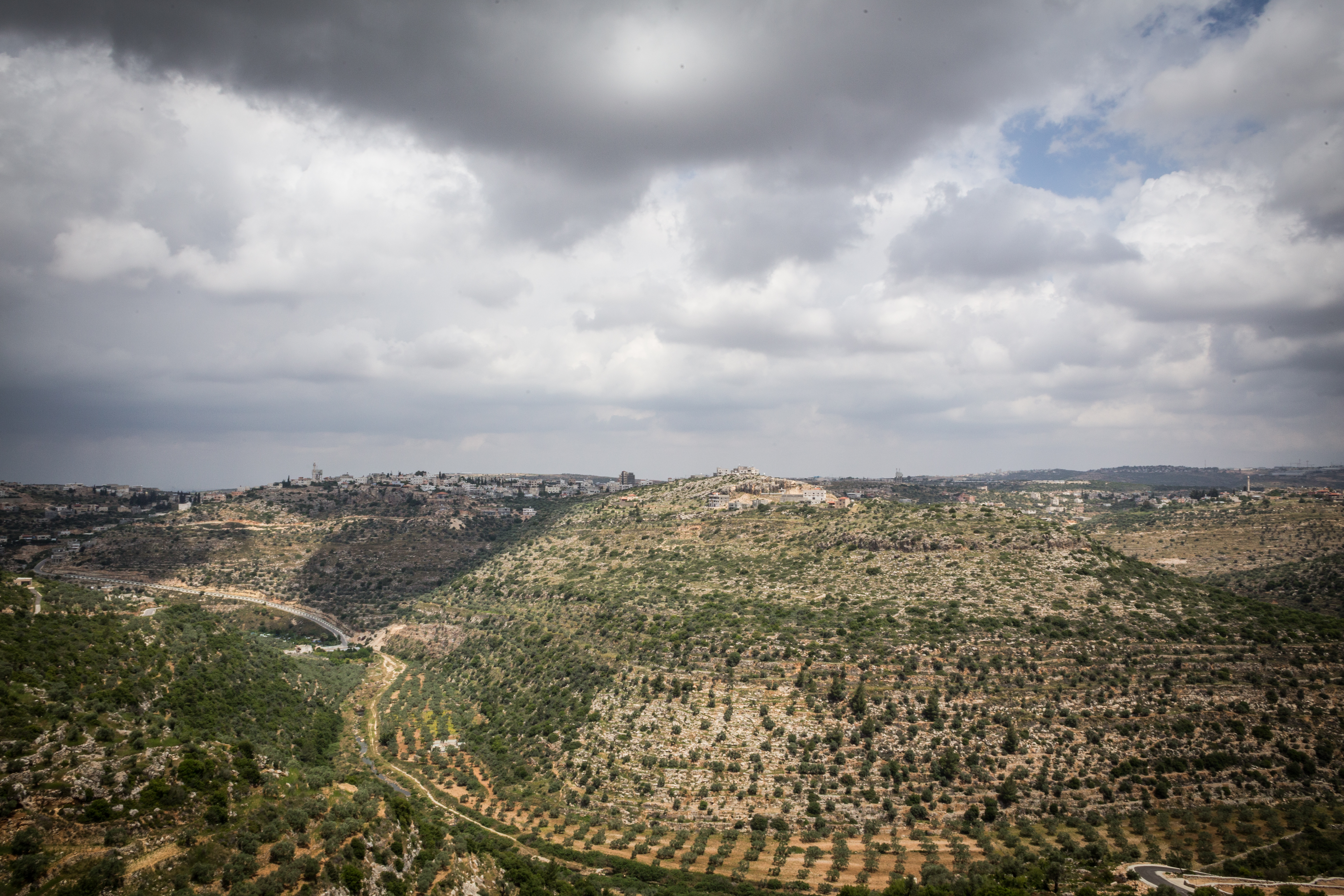 Au nord de Deir Ghassan, Palestine. A l’arrière-plan, à gauche et à droite, deux colonies israéliennes situées en Cisjordanie. © G.S.