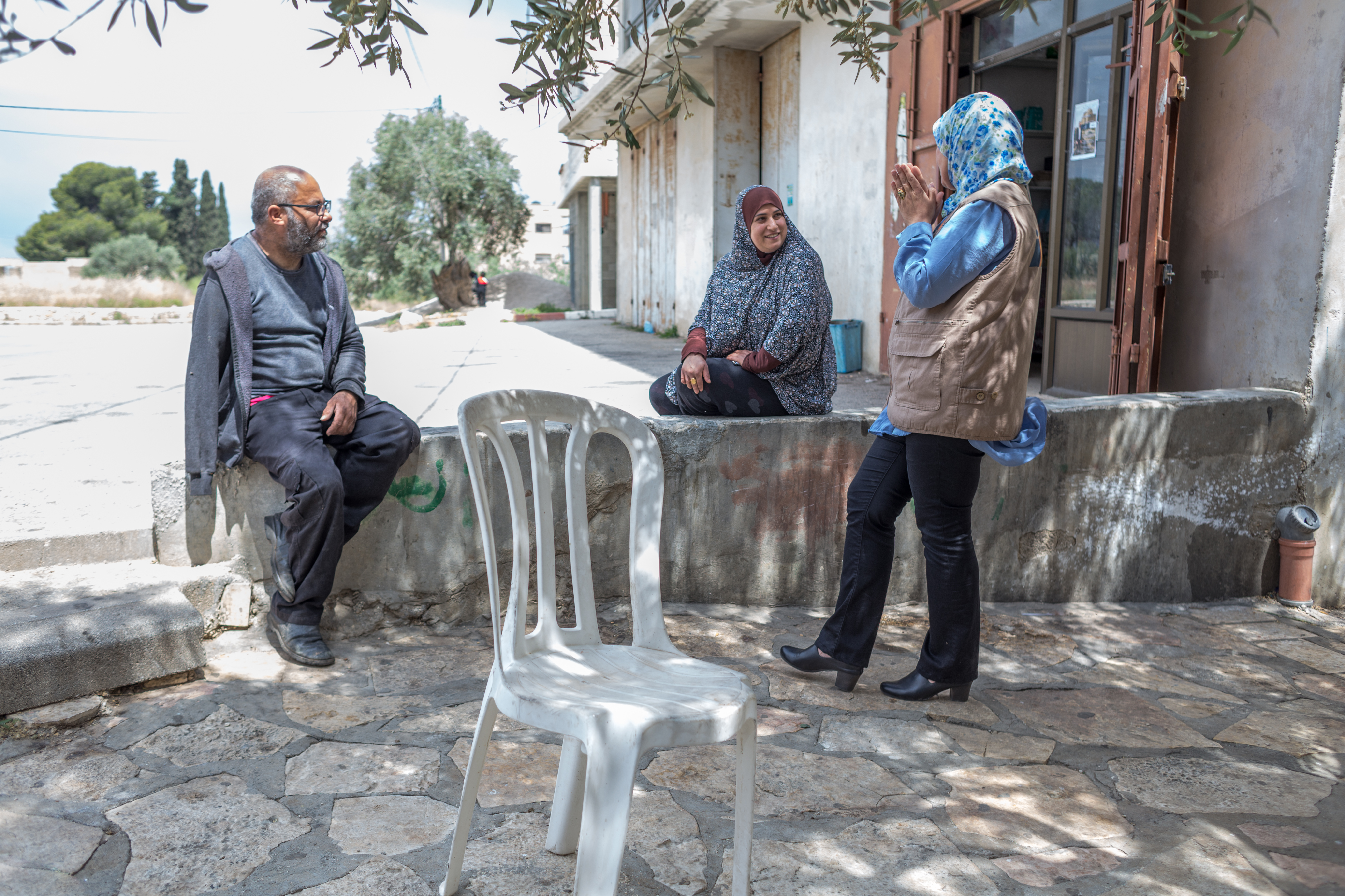 Nariman explique qu’au cours des trois dernières années, environ 350 femmes ont été impliquées dans le programme. «Elles nous sont adressées par le ministère palestinien du Développement social, nous les rencontrons et essayons de soutenir leurs idées, leurs projets, de les faire d’abord réfléchir à leur potentiel». C’est ainsi qu’ils sont entrés en contact avec Alayeh Shoaybi, qui est aujourd’hui bergère dans le village de Deir Ghassane. Il peut s’agir du développement d’une activité déjà existante, comme une petite épicerie, ou du lancement d’une nouvelle activité, comme l’élevage d’un cheptel. A l’entrée du village de Nabi Saleh, juste avant le grand panneau rouge qui marque l’entrée dans la zone A de la Cisjordanie, une tour en béton monte la garde, le drapeau israélien flotte sur le toit, et devant elle, un véhicule blindé et des soldats lourdement armés sont déployés. «Le matin, on peut passer, explique Naser, mais l’après-midi, ils ferment la route avec un checkpoint et les habitants de la région doivent faire un long trajet. Pour ceux qui travaillent à l’extérieur, c’est vraiment un problème».