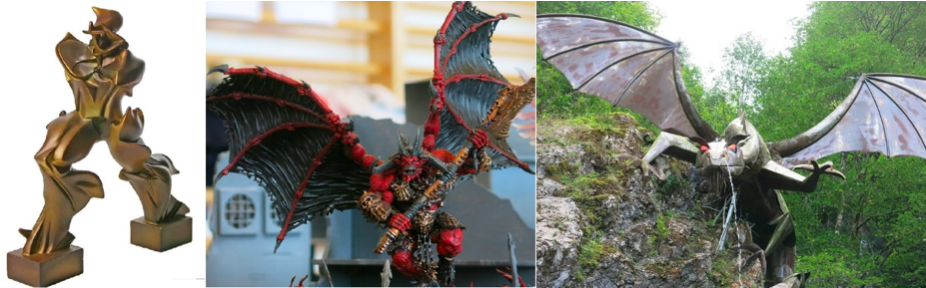 A gauche, L’homme en mouvement, Umberto Boccioni, 1913, Museum of Modern Art, New York. Au centre, une figurine de warhammer au tournoi de Pont-la-Ville. A droite, un dragon sur le sentier du tour du Schwarzsee.