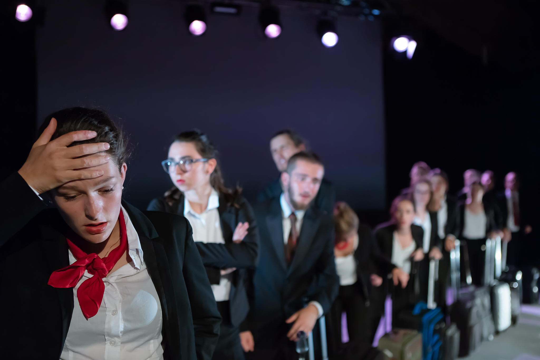 Des hommes et des femmes en costard-cravate enchainent les hôtels dans un rythme frénétique de réunions. Ils se bousculent dans les aéroports, leur avion a du retard, ils respirent fort, ils sont essoufflés. «Fuck, Fuck, Fuck», «Putain de machines de merde». Le propos est clairement identifiable dès les premières minutes du spectacle: nos vies sont faites de répétition de gestes déshumanisés dans un monde global, aseptisé et électronique; un système qui pousse tout un chacun à consommer, investir, manager, mener des briefings, se masturber, répondre à des mails et recommencer.