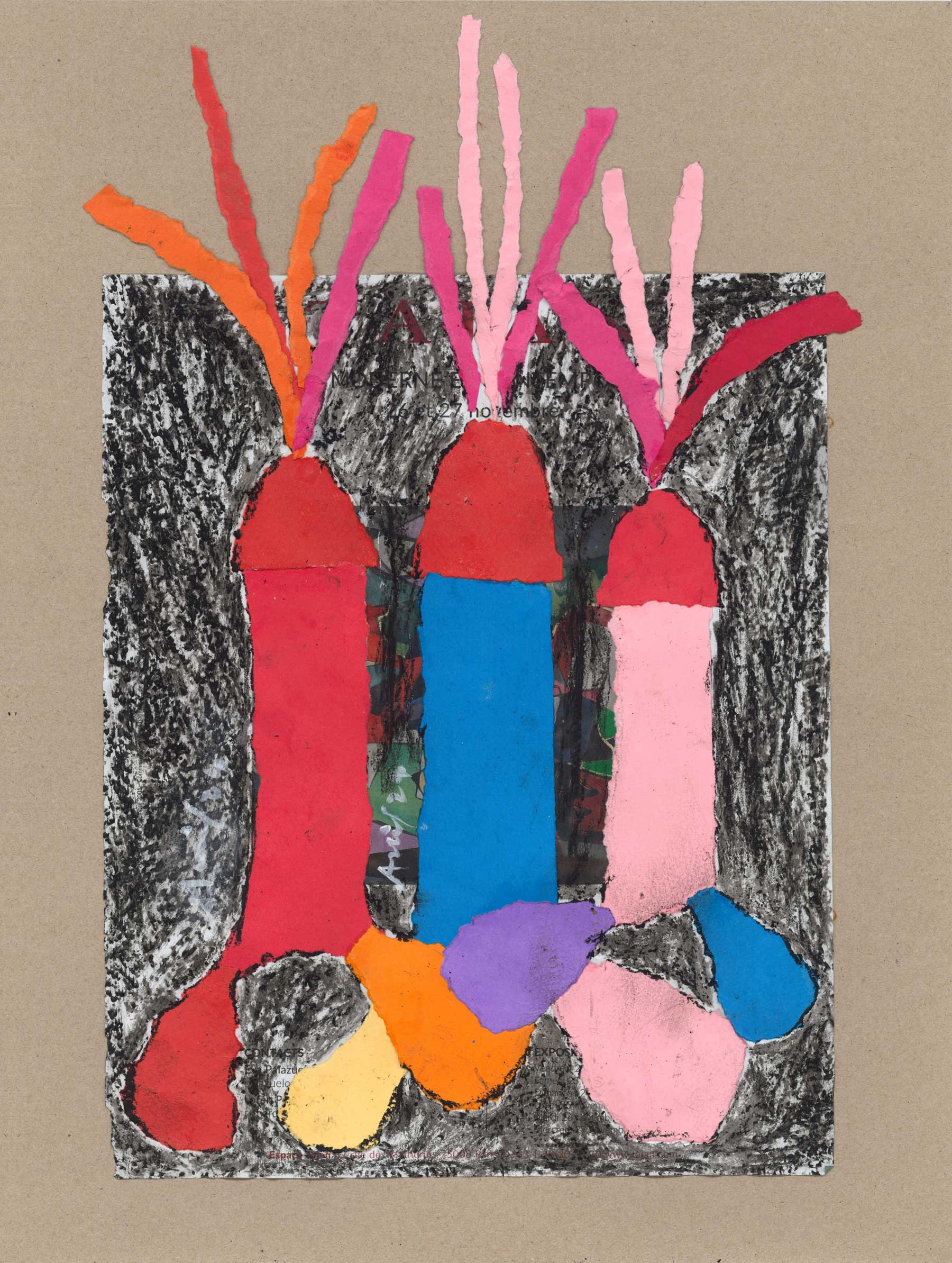 Sur les murs de la galerie RichterBuxtorf, les œuvres d’Armand Avril ouvrent des portes vers l’imaginaire. Le visiteur n’est plus à Lausanne, il baguenaude dans un paysage coloré où se croisent des chats coquins et des chattes taquines – à moins que ce soit l’inverse – sous des palmiers bien érigés dont les feuilles font comme un jet. Les œuvres, toutes verticales, sont composées de peinture, d’encre, de papiers découpés, de colle parfois… Les chats et les chattes ont pour support d'anciens sacs de farine, les palmiers des pages de magazines. C’est très gai, tout à fait insolent, délicieusement inconvenant, joyeusement libidineux.