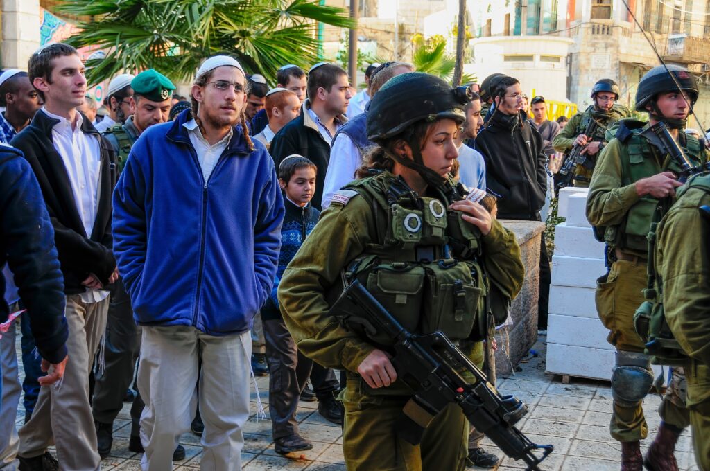 Soldats israéliens accompagnant des colons dans le quartier arabe de la ville d’Hébron, en Cisjordanie. © Shutterstock