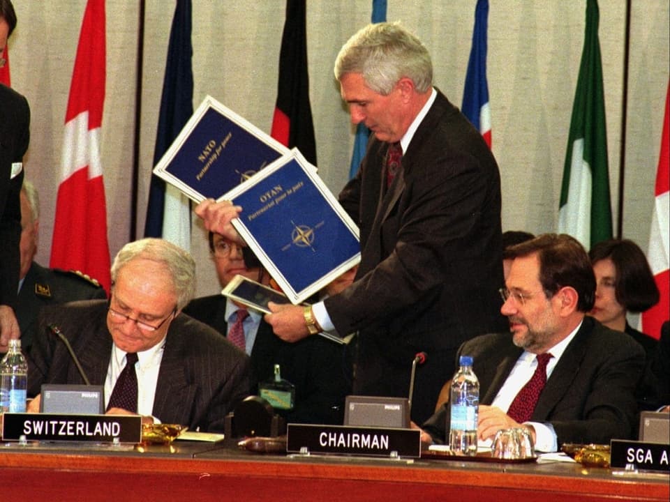 Flavio Cotti (à gauche) signant, le 11 décembre 1996, le Document-cadre du Partenariat pour la paix. © DR