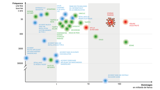 Diagramme des risques représentant 27 scénarios pour lesquels une fréquence a pu être estimée. ¦ Source: Office fédéral de la protection de la population OFPP. Infographie: Heidi.news, nor/mir
