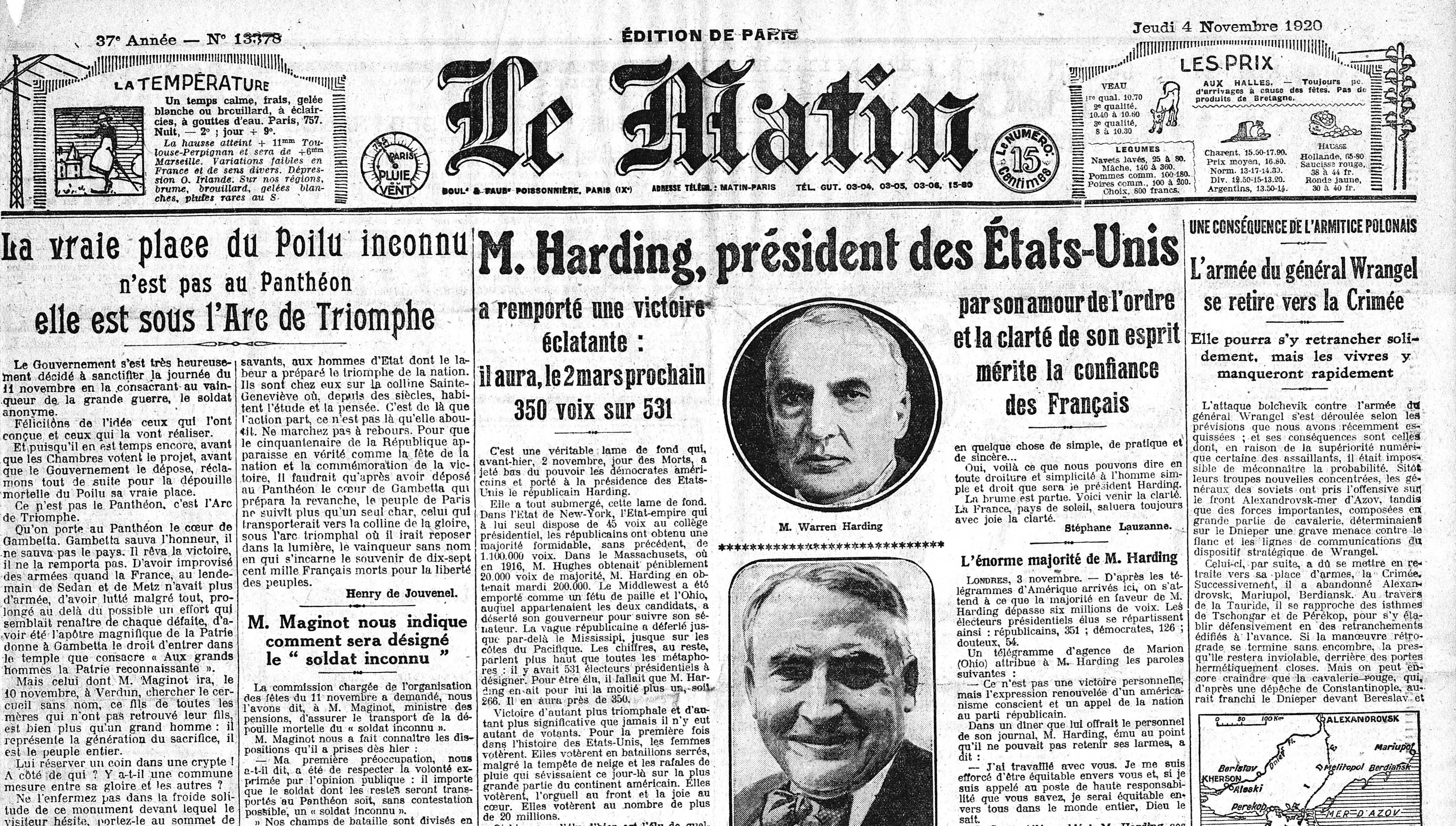 Première page du journal Le Matin, 4 novembre 1920 © BNF