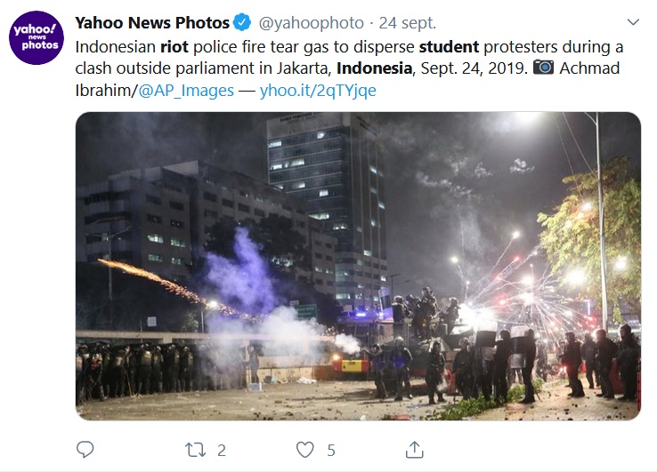 Pour la première fois depuis 1998, des manifestations violentes ont donc secoué le pays. Menées par les étudiants indonésiens qui s’organisent et se comportent de façon similaire aux étudiants hongkongais, selon le Spiegel, qui fait une comparaison entre les deux mouvements de révolte. Inspirés par leurs camarades Hongkongais, les jeunes Indonésiens ont compris comment les cartouches de gaz lacrymogène peuvent être rapidement rendues inoffensives et comment se connecter les uns aux autres via les réseaux sociaux. Ils n’ont pas non plus de leader, et utilisent internet pour se rassembler, s’organiser et dénoncer la répression policière dont ils sont victimes. En revanche, contrairement aux manifestations de ce territoire indépendant situé au sud-est de la Chine, la révolte indonésienne a fait deux morts. Ce qui a poussé le président, récemment élu pour un second mandat, à réagir.