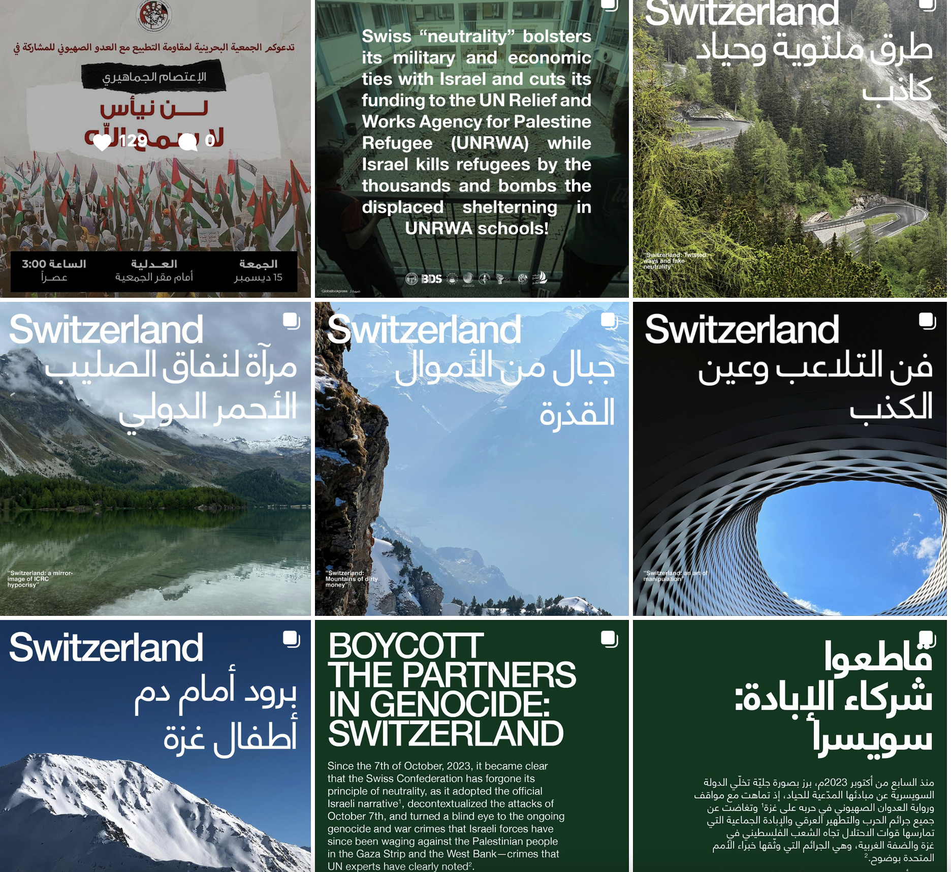 Un groupe nommé golf-can.com qui se dit «coalition du golfe contre la normalisation» diffuse sur Instagram une série d’attaques (voir ci-dessus), non seulement sur la question de l’UNRWA mais sur sa politique dans le conflit actuel. On y dénonce «l’art de la manipulation», les «voies tortueuses de la neutralité factice», «la criminalisation de la résistance palestinienne». L’accent est mis aussi sur les activités de sociétés suisses, ou basées en Suisse, dans les territoires occupés illégalement par Israël. La collaboration militaire entre les deux pays est vivement critiquée. Il en résulte un appel au boycott économique et touristique. Pas de panique: la page n’a pour l’instant que 2’137 followers! Mais c’est un signe à ne pas négliger.